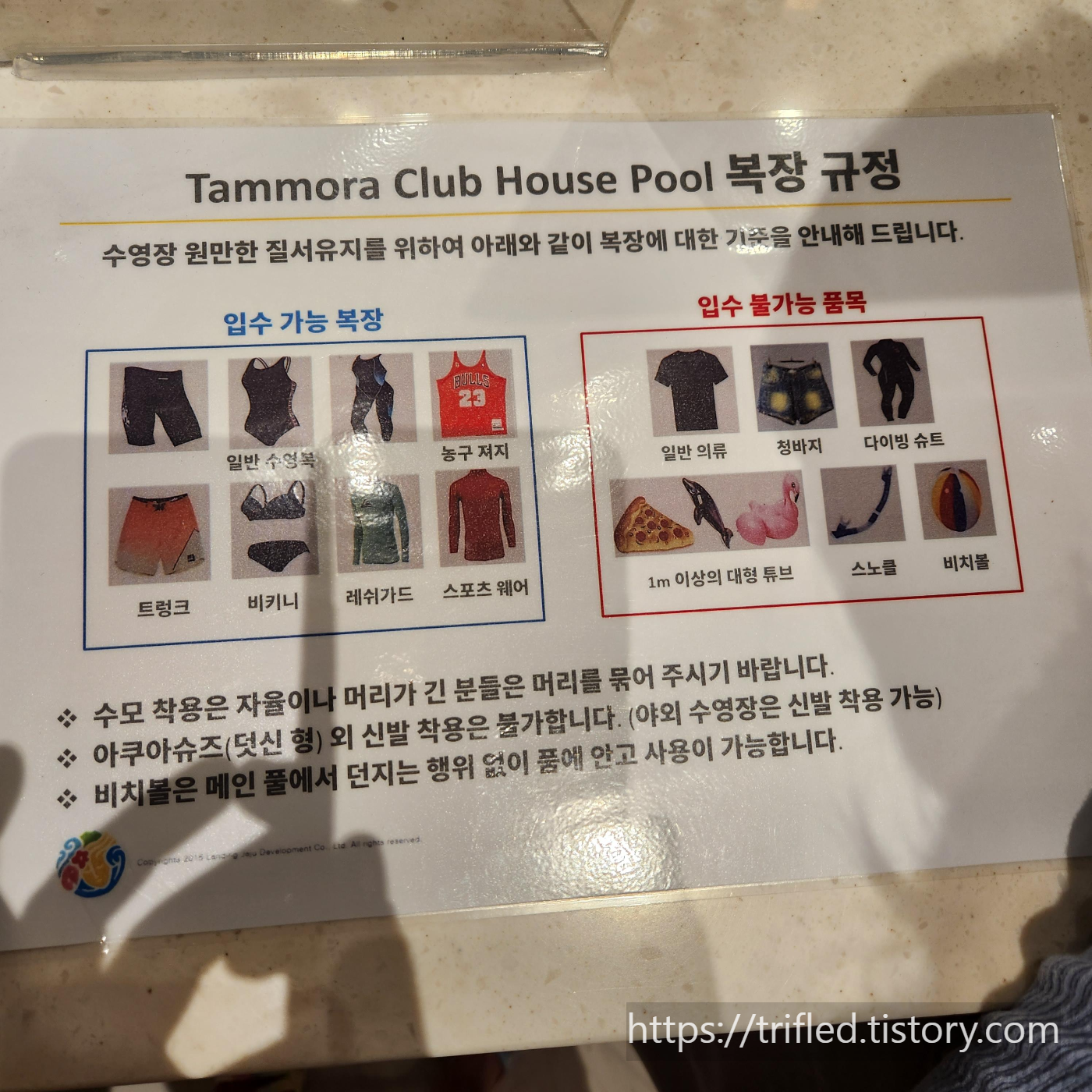 탐모라 수영장 입구는 조식당과 반대 방향에 있습니다.