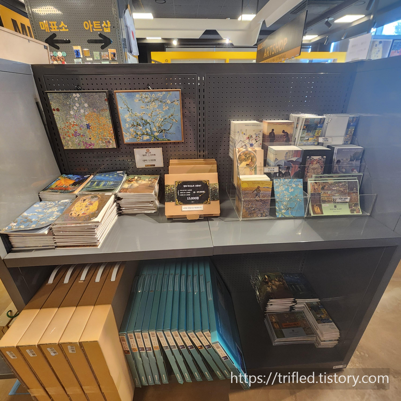 굿즈샵에는 다양한 명화 액자 상품과 문구류를 팔고 있습니다.